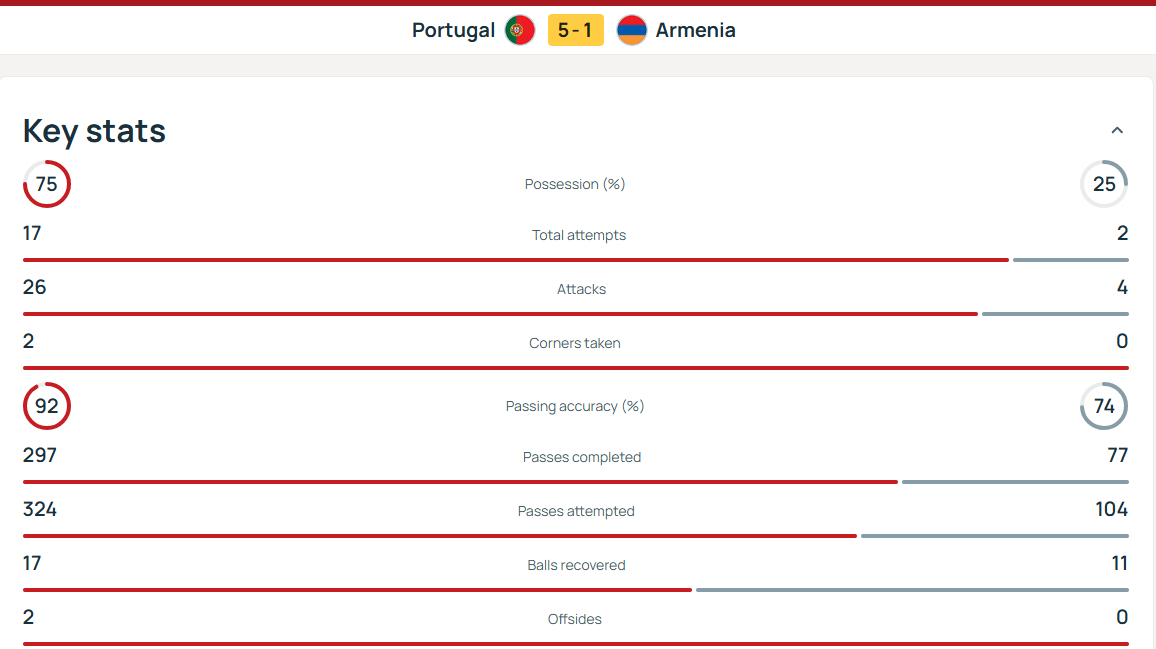 Đánh giá từ số liệu thống kê trong giờ nghỉ giải lao, tỷ lệ rê bóng của Bồ Đào Nha là gần 80%, với 17 cú sút hoang dã.