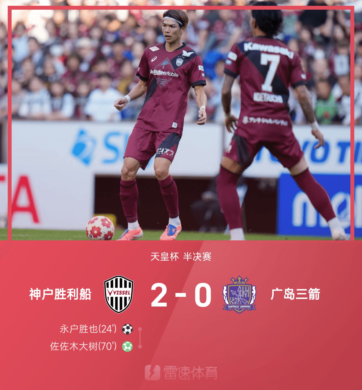 6686 Sports đưa tin ngày 16/11 rằng ở trận bán kết Emperor's Cup lần thứ 25, Kobe đã giành chiến thắng 2-0 trước Sanfrecce Hiroshima. Hiệp một, Katsuya Nagabe ghi bàn từ bên ngoài giúp Kobe mở tỉ số. Đổi bên đánh tiếp, Isamu Osako thực hiện quả phạt đền ở cự ly 12m và được cứu thua. Tuy nhiên, thủ môn của Hiroshima Sanfrecce đã vượt lên dẫn trước và bị phạt nặng. Cuối cùng, Daiki Sasaki tung cú sút điểm giúp Kobe giành chiến thắng và ấn định chiến thắng, đồng thời lọt vào chung kết Cúp Hoàng đế hai năm liên tiếp.