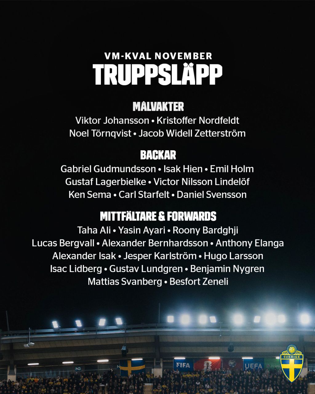 Thủ môn: Victor Johansson (Stoke City), Nordfeldt (AIK Solna), Zetterle (Derby County), Tallqvist (Miaalby)