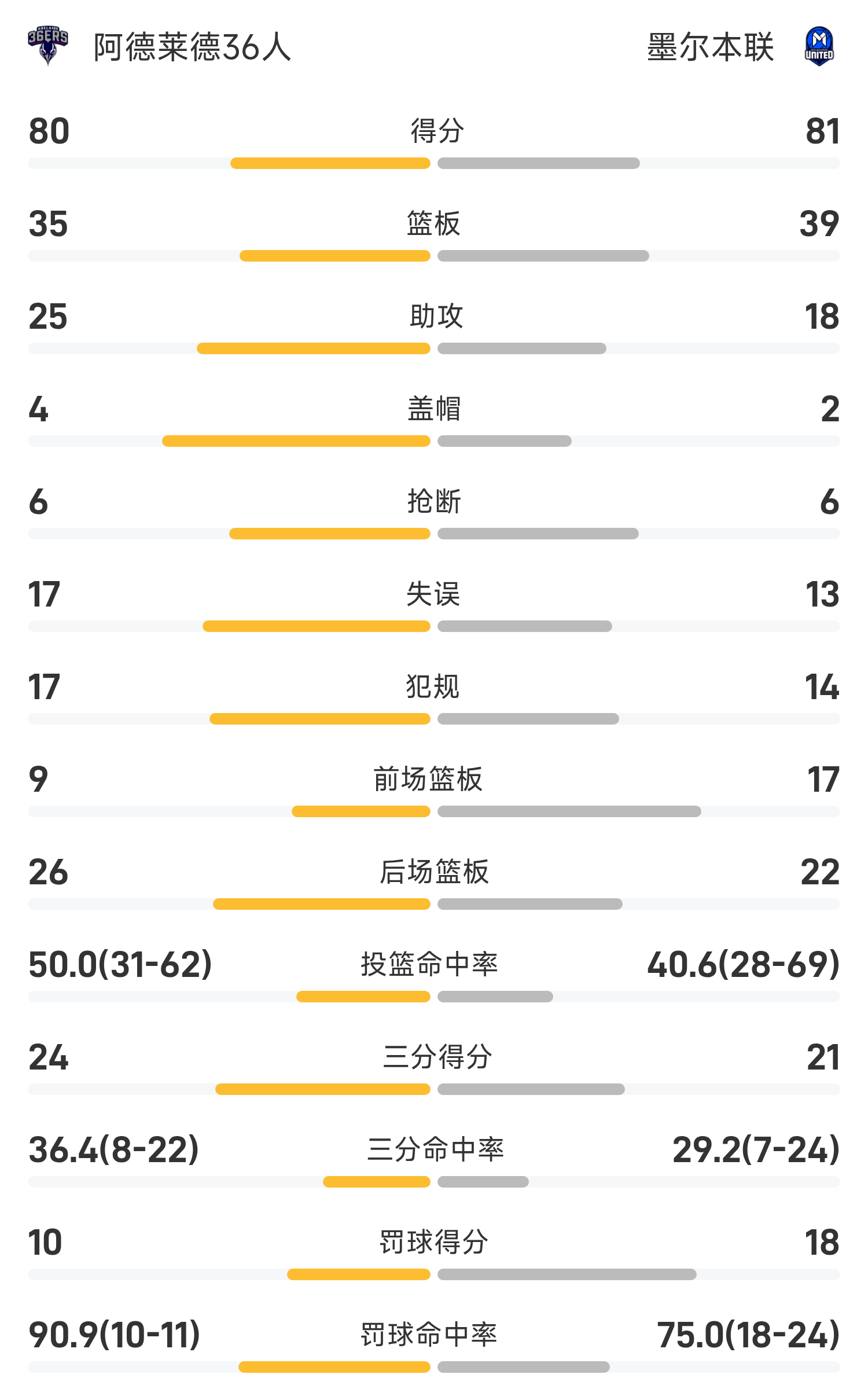 Cuối trận, Melbourne United đã đánh bại Adelaide 36ers với tỷ số 81-80.