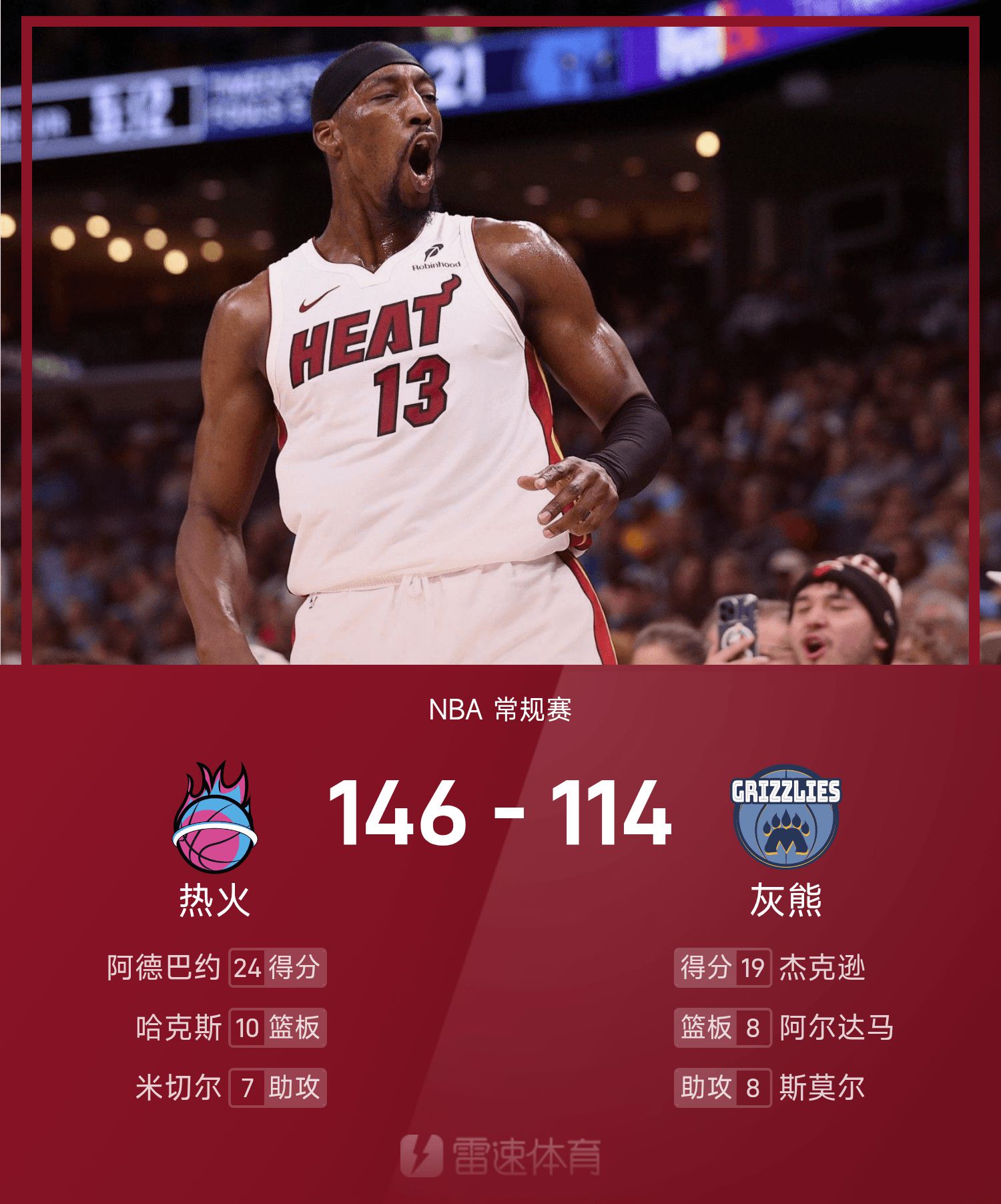 6686 Thể thao, ngày 25 tháng 10 Trong mùa giải NBA thường lệ 25/26, Grizzlies đối mặt với Heat. Kết thúc trận đấu, Grizzlies thua Heat với tỷ số 114-146. Adebayor ghi được 24 điểm cao nhất trận, 5 rebound và 4 kiến tạo, đưa Heat đến chiến thắng.