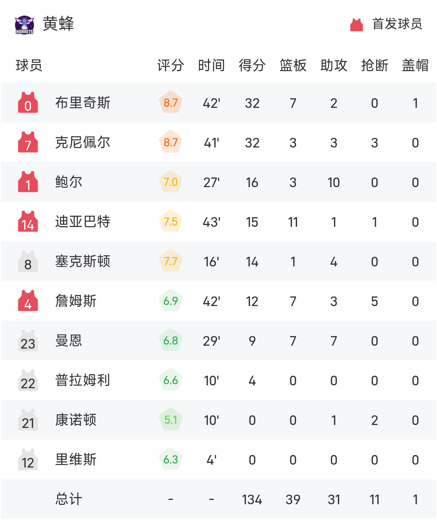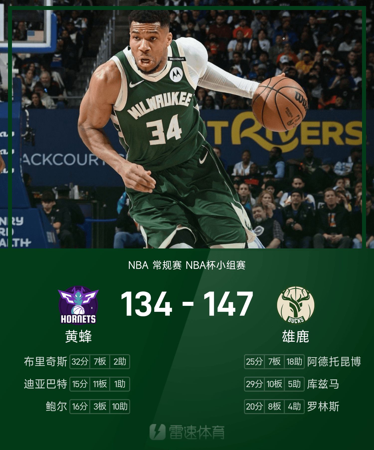 6686 Thể thao Tin tức ngày 15 tháng 11 Trong trận đấu vòng bảng NBA Cup mùa giải thường lệ 25/26, Bucks đối mặt với Hornets. Kết thúc trận đấu, Bucks đánh bại Hornets với tỷ số 147-134. Kuzma ghi 29 điểm, 10 rebound và 5 kiến tạo để dẫn dắt đội đến chiến thắng. Bridges ghi được 32 điểm cao nhất trận, 7 rebound và 2 kiến tạo.