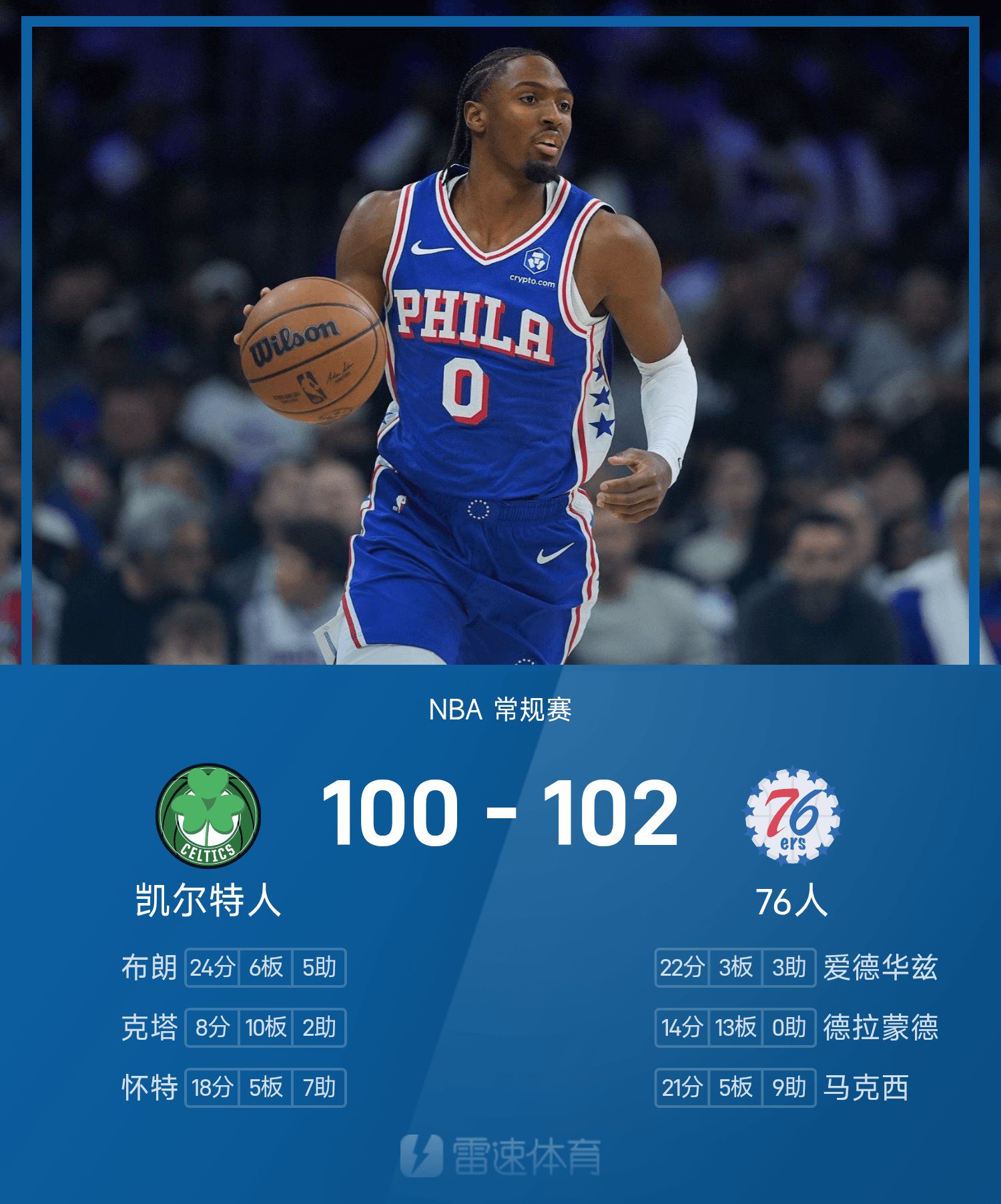 Cuối trận, 76ers đã đánh bại Celtics với tỷ số 102-100.