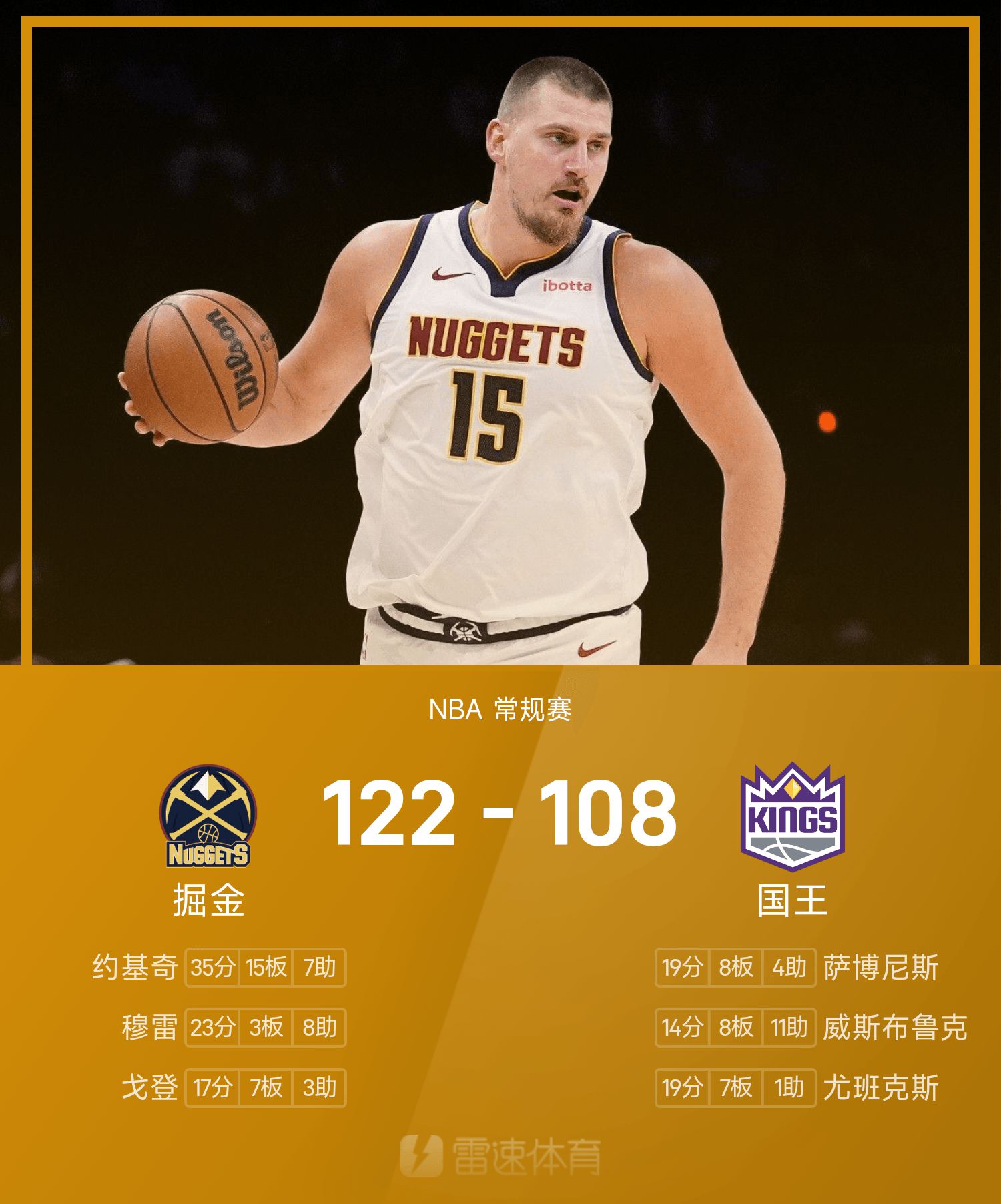 Jokic ghi được 35 điểm, 15 rebound và 7 kiến tạo. Westbrook ghi được một cú đúp nhưng không thành công, và Nuggets dễ dàng đánh bại Kings.