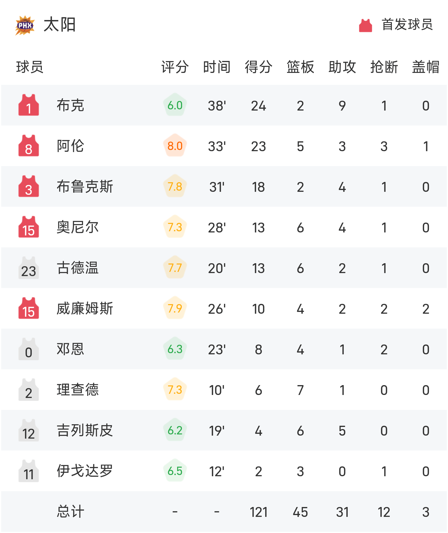 Booker đã ghi được 24 điểm cao nhất trận, 2 rebound và 9 kiến tạo, đưa Suns đến chiến thắng.