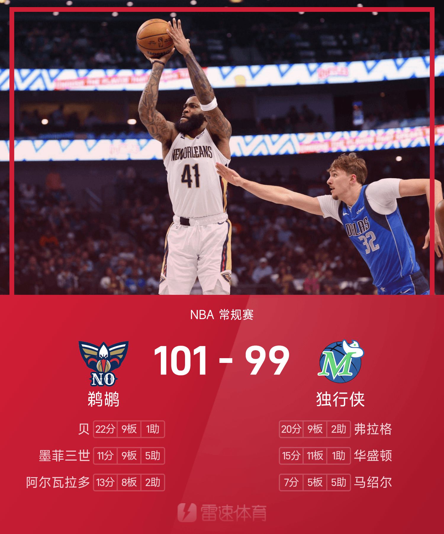 Bey ghi được 22 điểm cao nhất trận, 9 rebound và 1 kiến tạo, đưa Pelicans đến chiến thắng. Flagg, lựa chọn hàng đầu của Mavericks, đã bỏ lỡ trận hòa và ghi được 20 điểm.