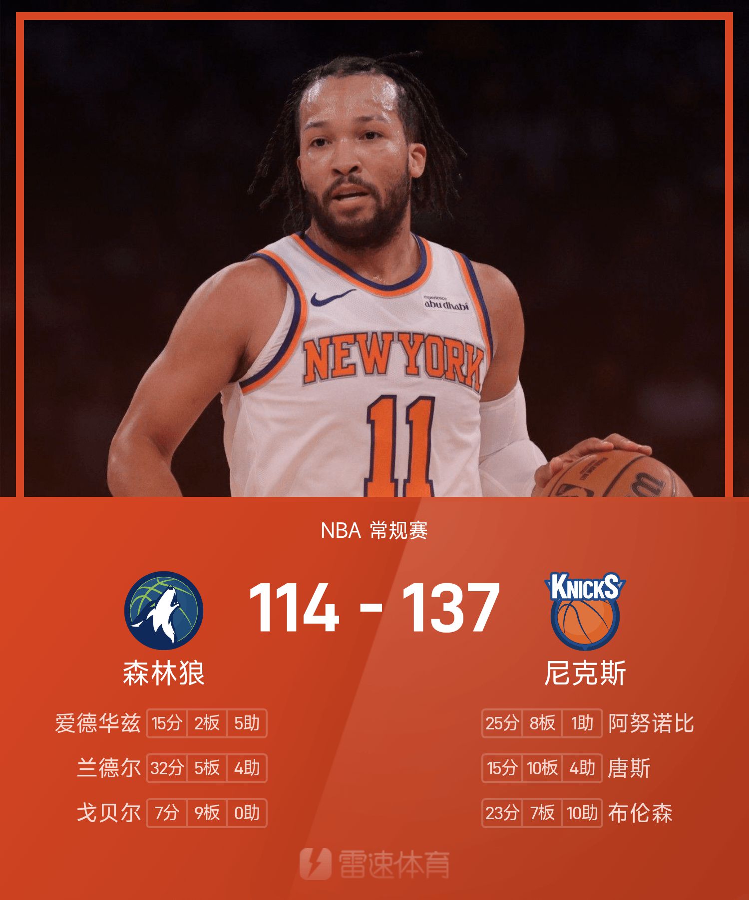 Báo cáo trận đấu NBA: Đầu to 23+7+10, Knicks đánh bại Timberwolves 137-114