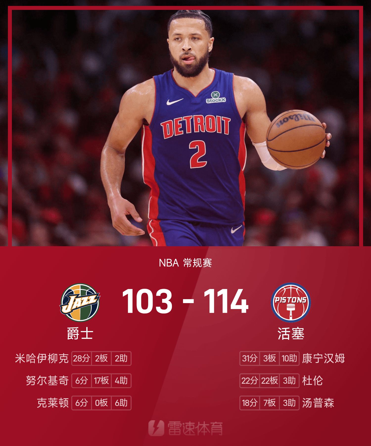 Cunningham có 31 điểm và 10 pha kiến tạo, Duren có 22 điểm và 22 rebound, còn Pistons đã đánh bại Jazz.